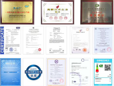 目前我们公司产品已经取得各项国内国际企业及产品认证证书,例如ISO9001、CCC、CE和FCC等证书。 此外,畅想视界已通过“国家高新技术企业”认定,并获得“英特尔®智造基地成员”授权,“英特尔® 一体机电脑ODM合作厂商”认证,以及“深圳市计算机协会会员”等荣誉。