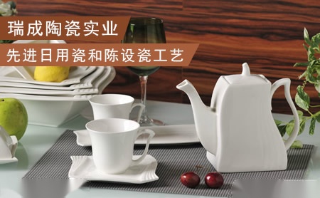 瑞成陶瓷实业有限公司专业生产各类日用瓷和陈设瓷。公司设备优良,技术力量雄厚,拥有大批的专业技术人才。产品种类齐全,品种繁多。质量稳定、价格合理. 中温色釉、玻璃釉日用瓷产品做工精巧,器型新颖,釉色丰富,色彩艳丽。 强化瓷餐具款式高雅,采用高含量氧化铝配方,坚固耐用,适用于烤炉、微波炉、洗碗机、冰箱。产品经检验,铅镉溶出量符合国际标准的要求。